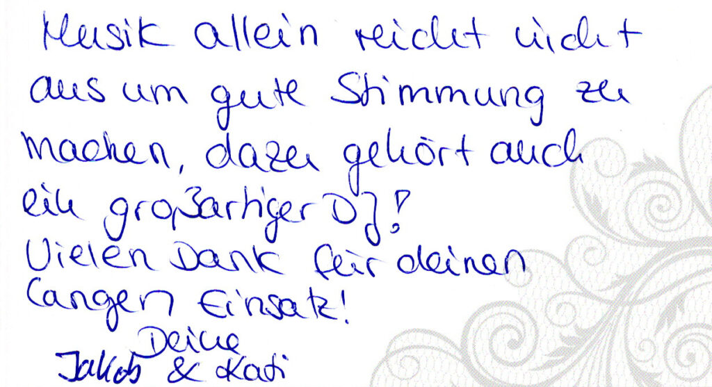 Schön, dass Du hier bist! Ich bin seit über 20 Jahren als DJ unterwegs und freue mich, wenn ich Dein Event musikalisch begleiten darf. Ob Hochzeit, Geburtstag, Firmenfeier oder einfach eine Party mit Freunden – ich sorge für die perfekte Stimmung. Mein Einsatzgebiet: Stuttgart und bis zu 150 km darüber hinaus.