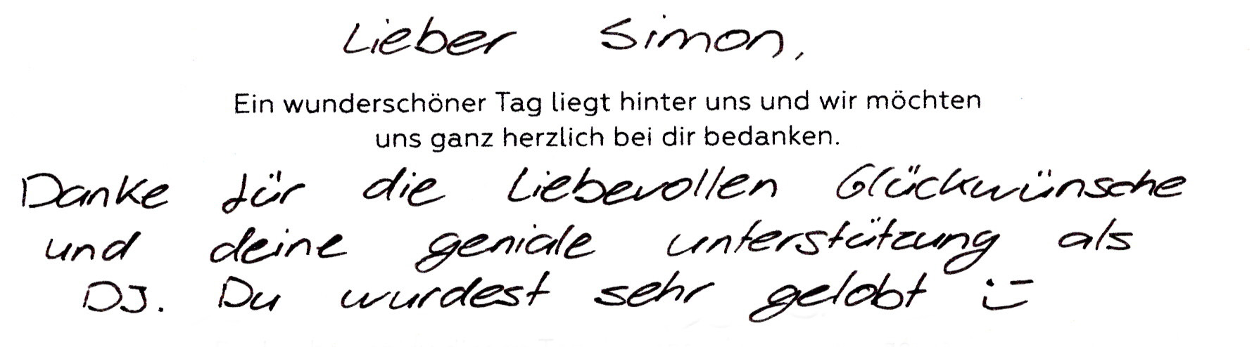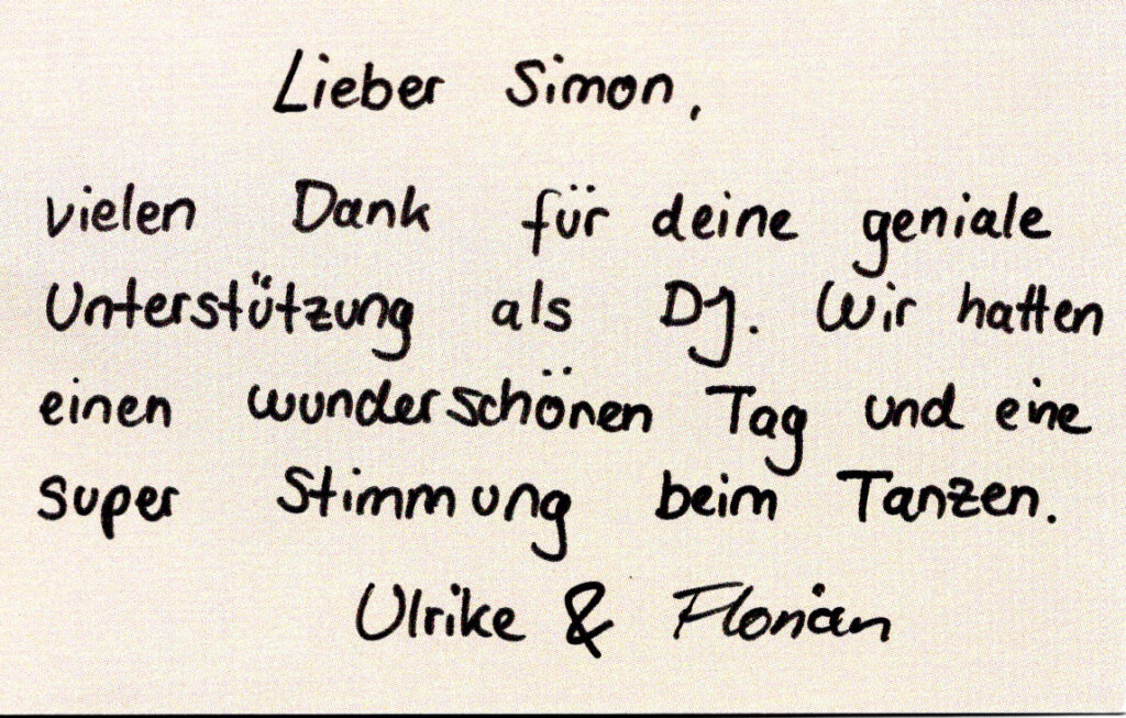 Meine DJ-Karriere begann ganz klassisch auf Geburtstagsfeiern. Es hat so viel Spaß gemacht, dass schnell klar war: „Simon kümmert sich um die Musik!“ Kurz darauf folgten die ersten Hochzeiten im Freundeskreis – und damit wuchs auch meine Erfahrung. Der Schritt in die professionelle DJ-Welt war dann nur logisch.