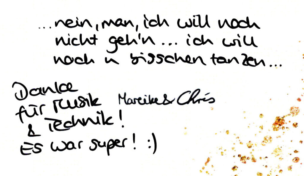 Professionelle Sound- und Lichttechnik bringe ich mit – diese reicht für bis zu 300 Gäste. Mikrofone für Reden oder Anschlüsse für Instrumente sind auf Wunsch ebenfalls dabei.